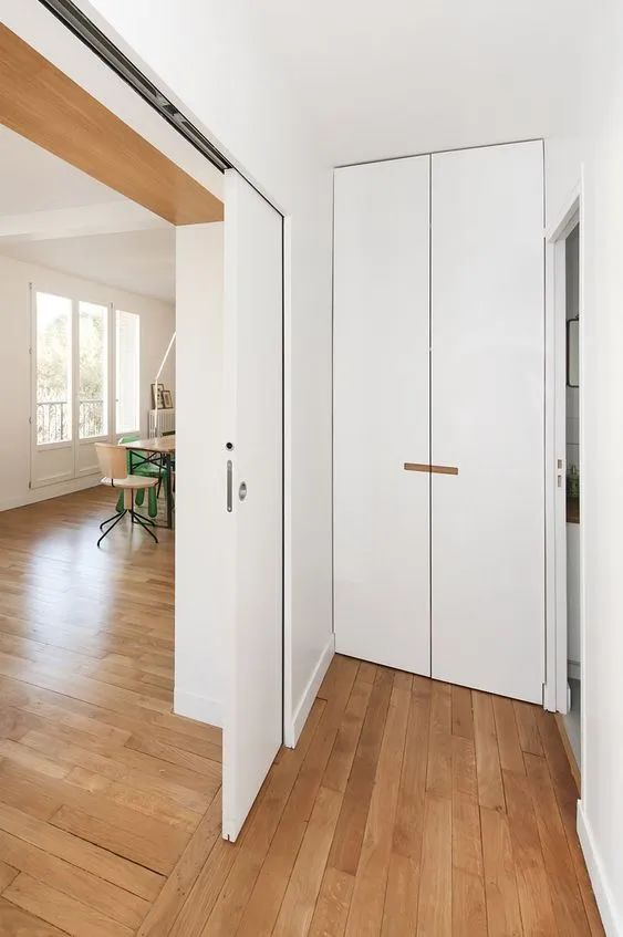 口袋门是把门板嵌入在墙体里的一种门,摒弃铰链,利用轨道滑进或滑出墙壁凹口来开合的门,可藏可显,节省空间,增加空间设计感。