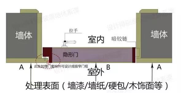 其次如更想达到以假乱真的效果,门上的踢脚线位置也要设计进去,如表面墙漆、墙布饰面的隐形门通常都会另做踢脚线,木饰面的除外。