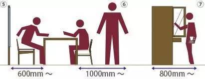 上图表示的是能够保证一个人通过的标准尺寸是600mm,两个人同时通过则为900~1200mm。当然这是家居的尺寸而不适用于公共建筑。
