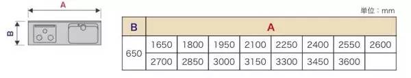 图中B为宽度:650mm。当然也有更窄的,国内也有做到550mm甚至500mm左右的。不过目前厨具越来越大的趋势加上考虑使用的便利性,建议做到650甚至700mm左右。A是标准尺寸的长度,可以做到豪华的3600mm。