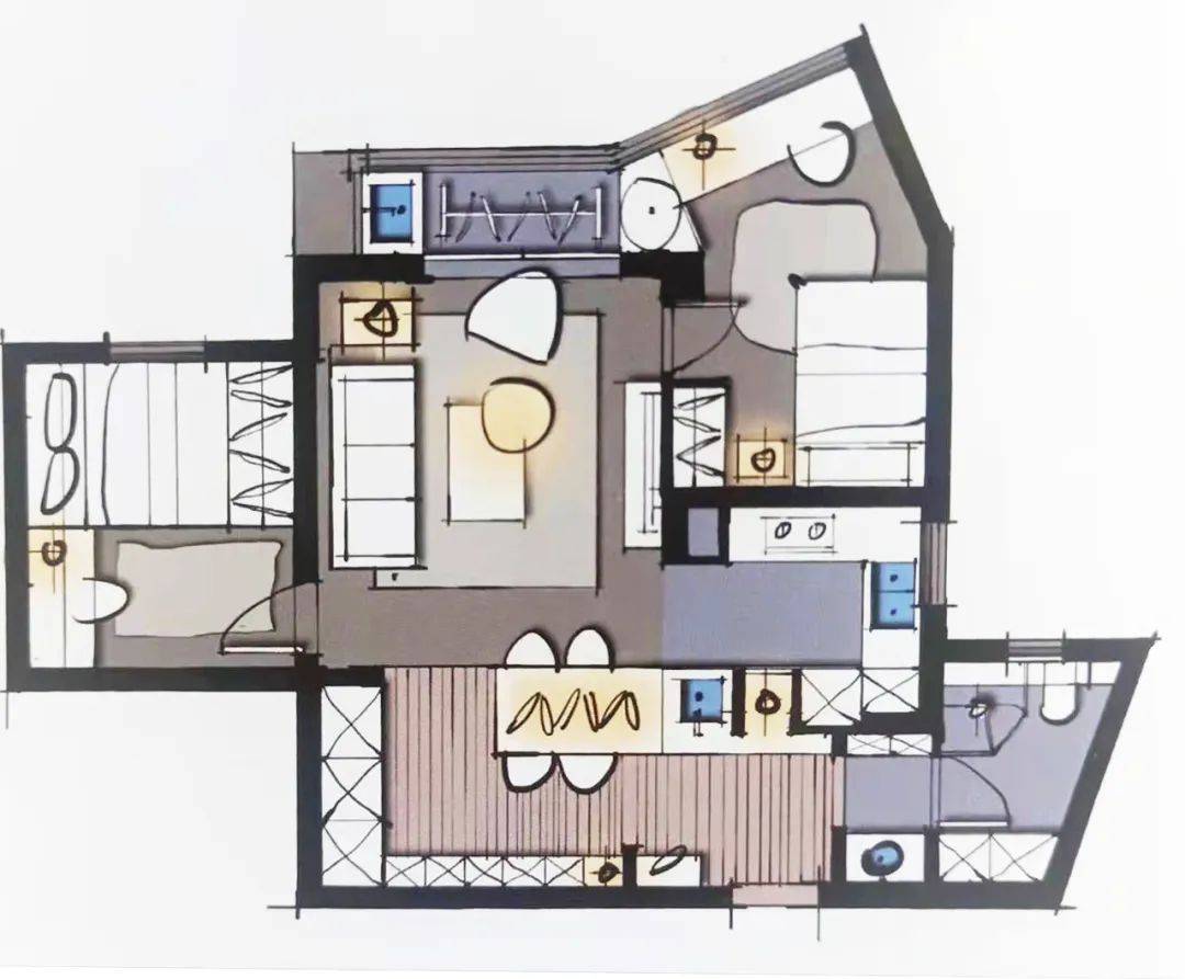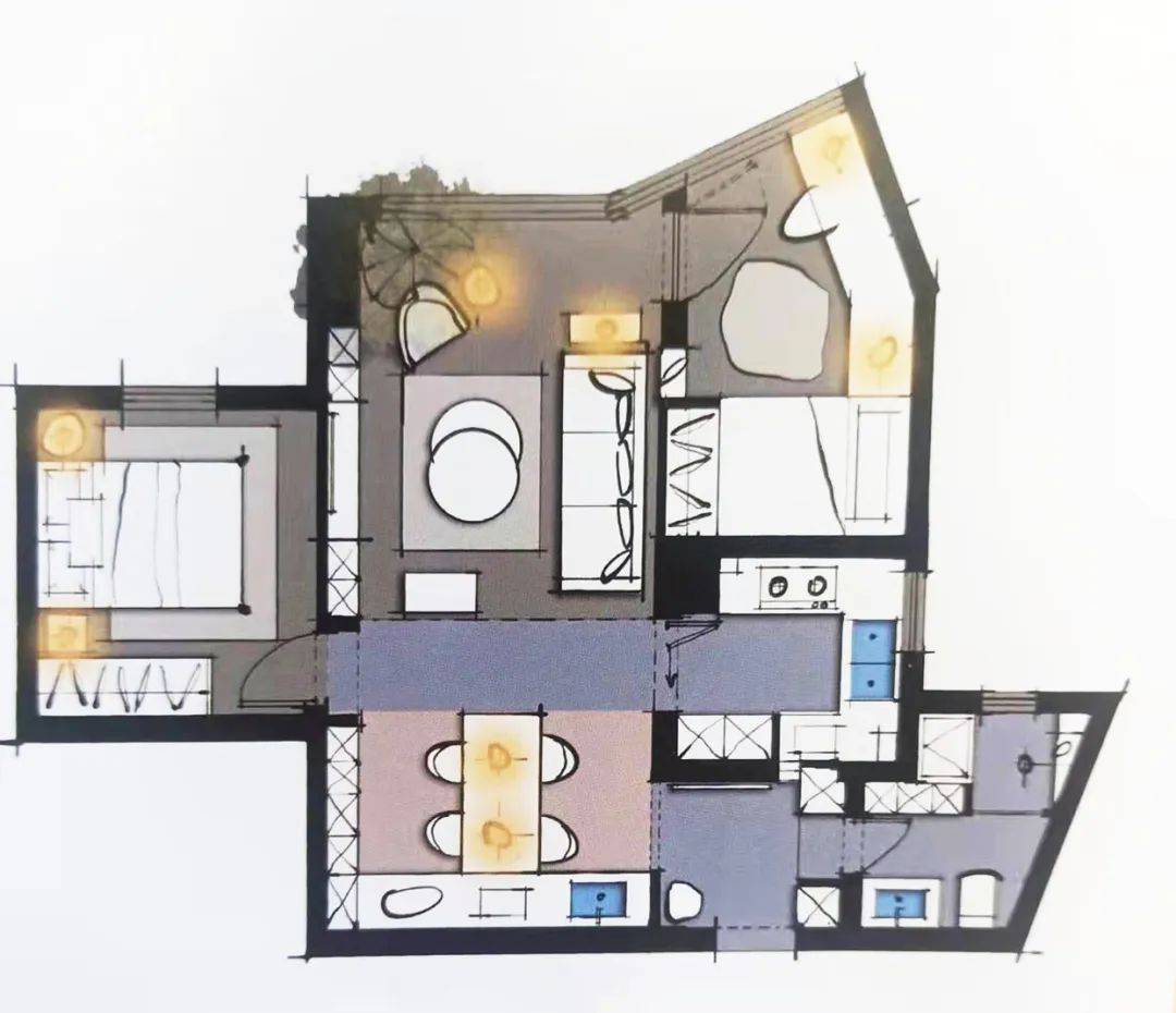 所以,一个高质量的布局方案应该考虑:空间的动线、光线、比例、材质、结构、地面、立面、顶面、整体平衡、功能与形式、趣味感、仪式感、生活方式、心理视线引导之间的关系。