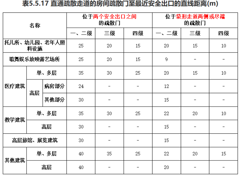 《建规》5.5.17-1:“直通疏散走道的房间疏散门至最近安全出口的直线距离不应大于表5.5.17的规定。”(参照上一小节中已附表格)