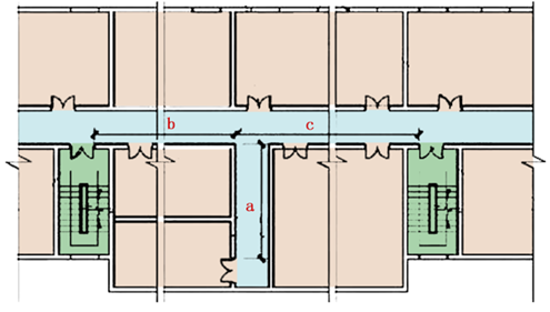 上图所示的T形疏散走道,单向疏散与双向疏散组合存在。