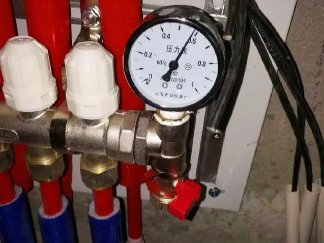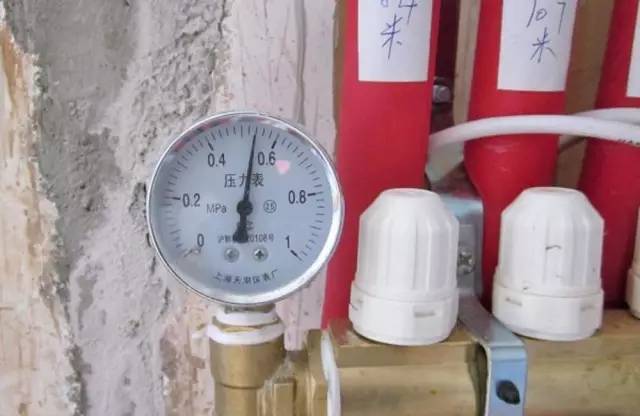 加热管采用自来水打压试验并保压施工,确保水管无渗漏现象。水压试验压力应为工作压力的1.5倍,且不小于0.6Mpa,验收完成后交接,压力表需地面面层施工完成后撤除。