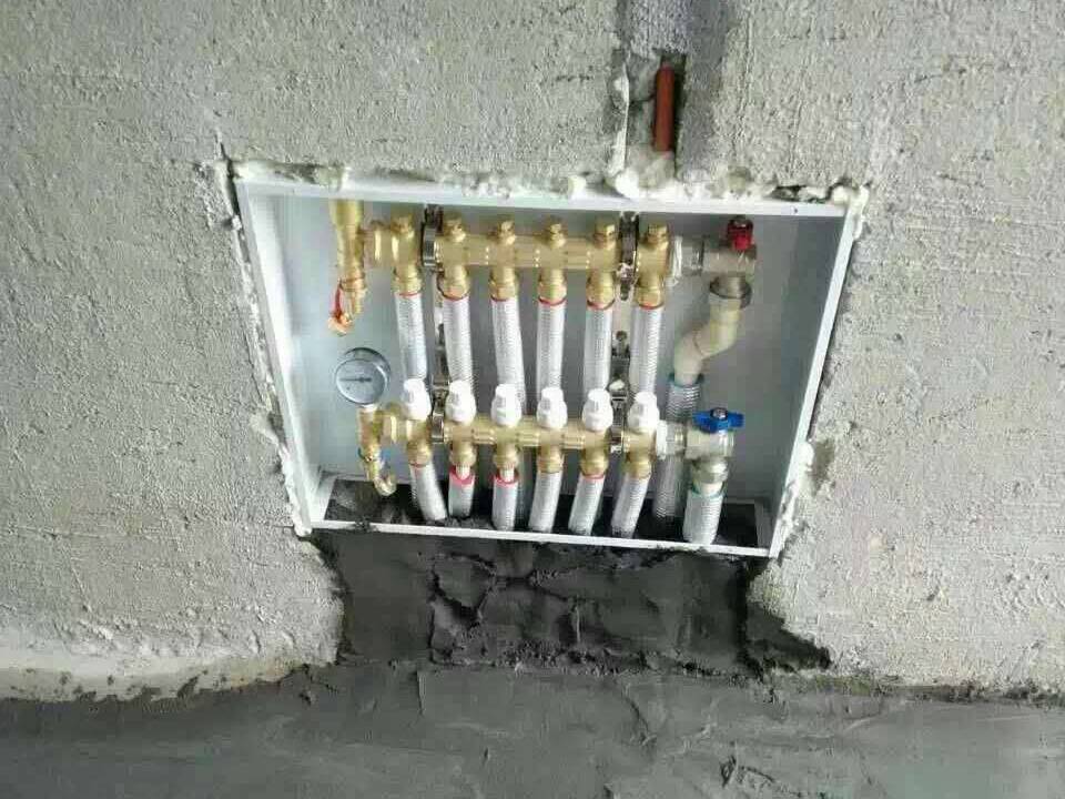 先为分集水器到安装房间的管道套上专用保温套,然后将管道连接到分集水器处,将管道的一端与温控阀门相连接,再将分集水器固定好。最后从注水排气阀注入清水进行水压试验,测试合格后,方可进行下一步施工。