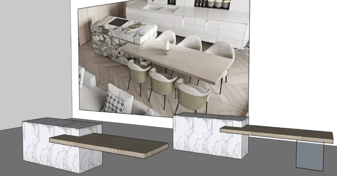 该方案中就餐台面挑出的部分更长,厚度也比较薄,从而提升了形式和美感,同样的原理,我们先来分析一下实际落地情况。