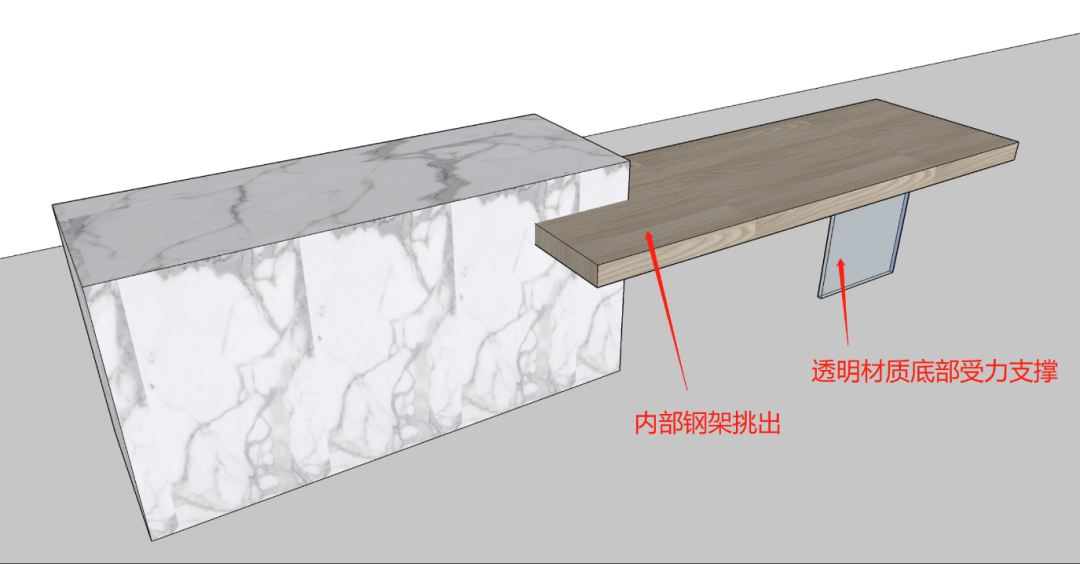a、方式一:由于悬挑延伸出的部分比较长,在悬挑的底部可以采用玻璃钢或者其他能够受力且透明的材质做支撑,并且弱化其存在感。