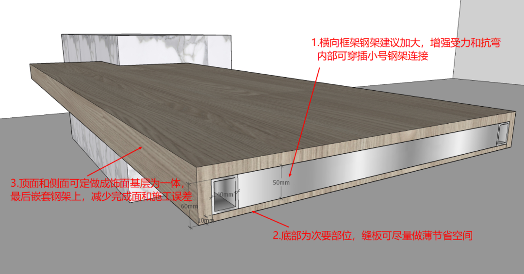 b、方式二:也可以直接全钢架挑出,饰面材料顶面和侧面可以一体化,减少基层工序和完成面尺寸,底部材料可以尽量做薄,为中间钢架留出多的空间,中间挑出的钢架尽量做大,增加受力和抗弯,钢架框架内部可以用小号钢架连接,减轻自重。