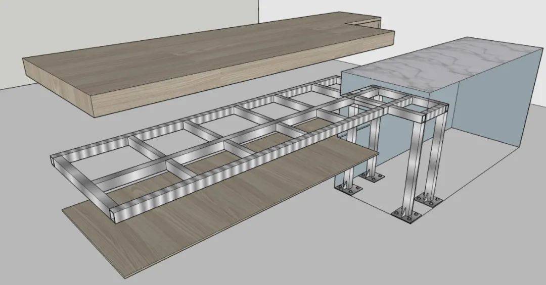 通过层层剖析,我们可以看出此服务台可以通过钢结构焊接出主体框架,再与墙体相连,最后做上基层和饰面材料。