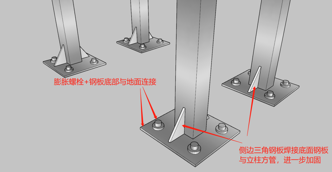 竖向钢架作为主要受力部分,在和地面钢板连接的时候,两侧需加三角钢板使地面钢板与侧面钢架立柱连接受力更牢固,必要的情况可以再往后延伸增加立柱钢架。