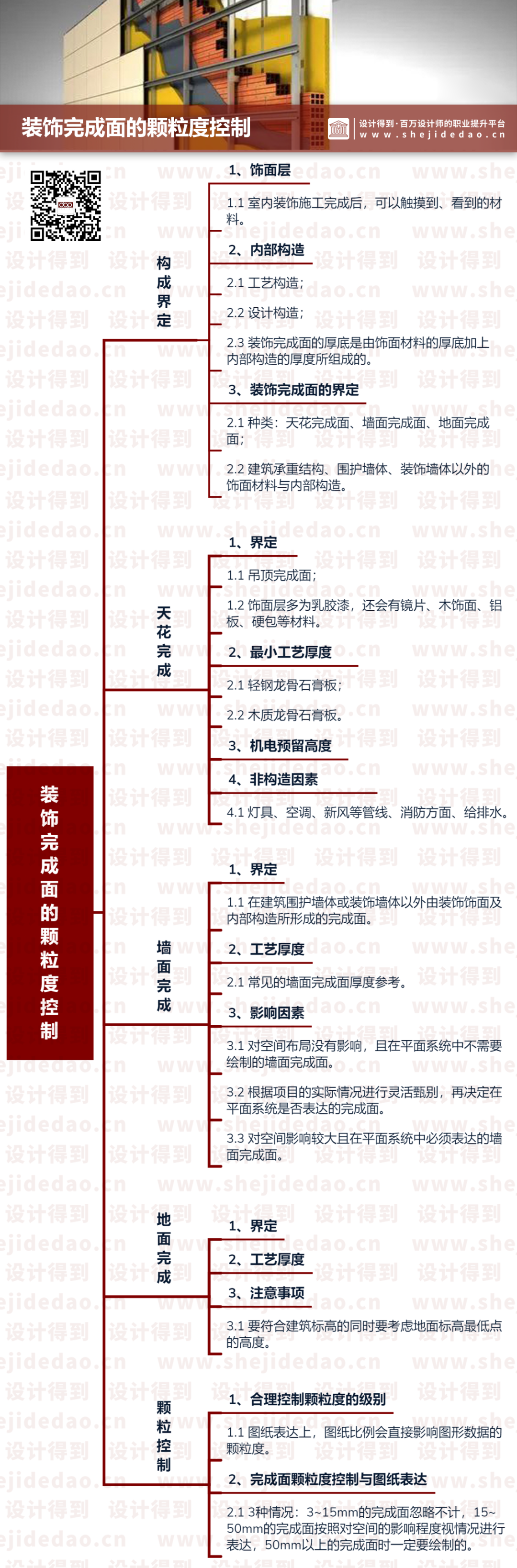 装饰完成面包括空间6个界面的完成面,归纳起来分3类:天花完成面、墙面完成面、地面完成面。