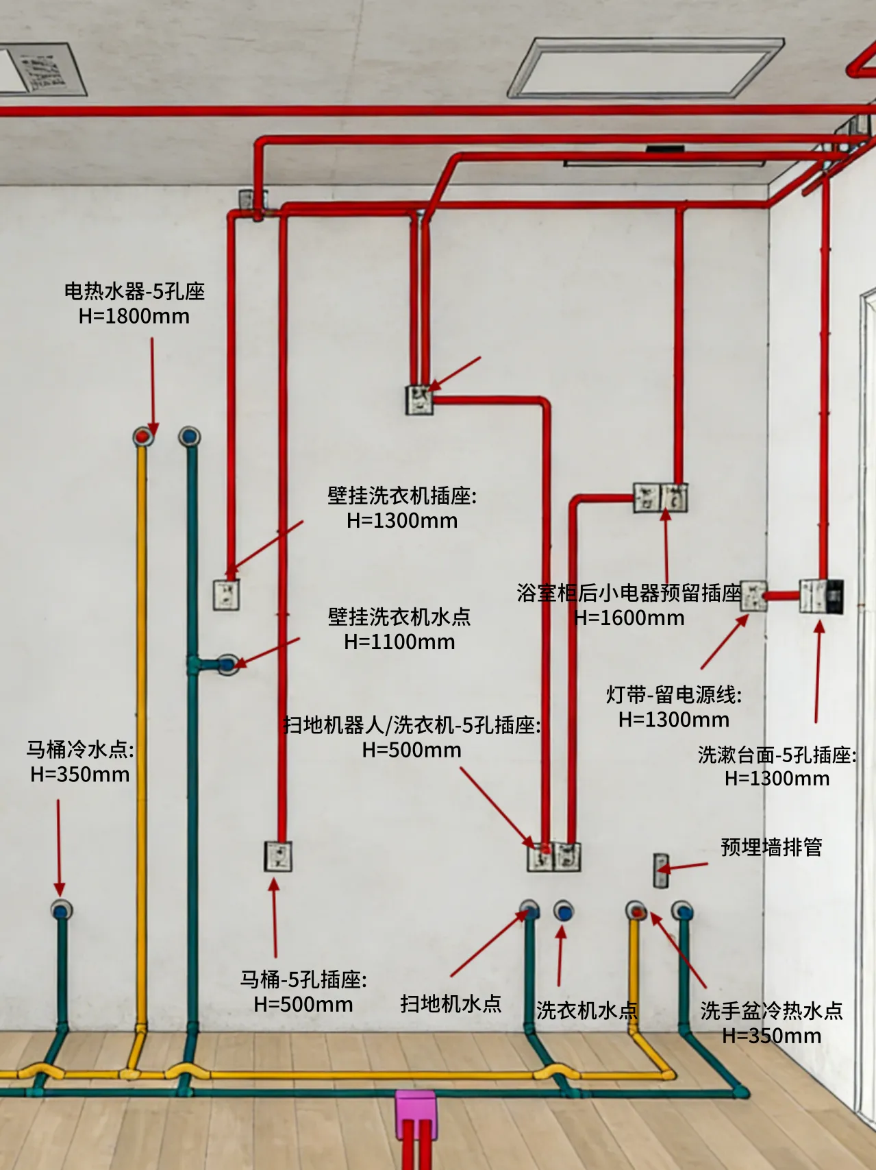 灵活预留:“核心位精准,次位留余量才是王道!厨房、主卧、书房等高频使用区,严格按家具尺寸预埋;客厅、阳台等灵活区域,按通用位预埋且间距控制在1.0-1.2m,既保证日常使用精准,又兼顾业主后期改造需求,平衡专业度和实用性。”