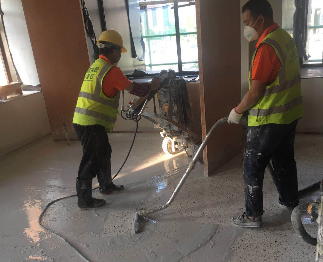 1、用真空无尘研磨机,装配六角磨头进行试磨,磨出的粉尘无胶状物粘附磨头,此时说明养护期已到,可以进行研磨找平,研磨找平时应按先横后纵的顺序进行,研磨行行间应相互交接三分之一为宜, 研磨机应左右摇摆,根据表面的打磨情况均匀控制研磨机磨行速度,不得任意停留或改变磨行速度,以免造成局部凹陷、不平整以及漏磨等现象;