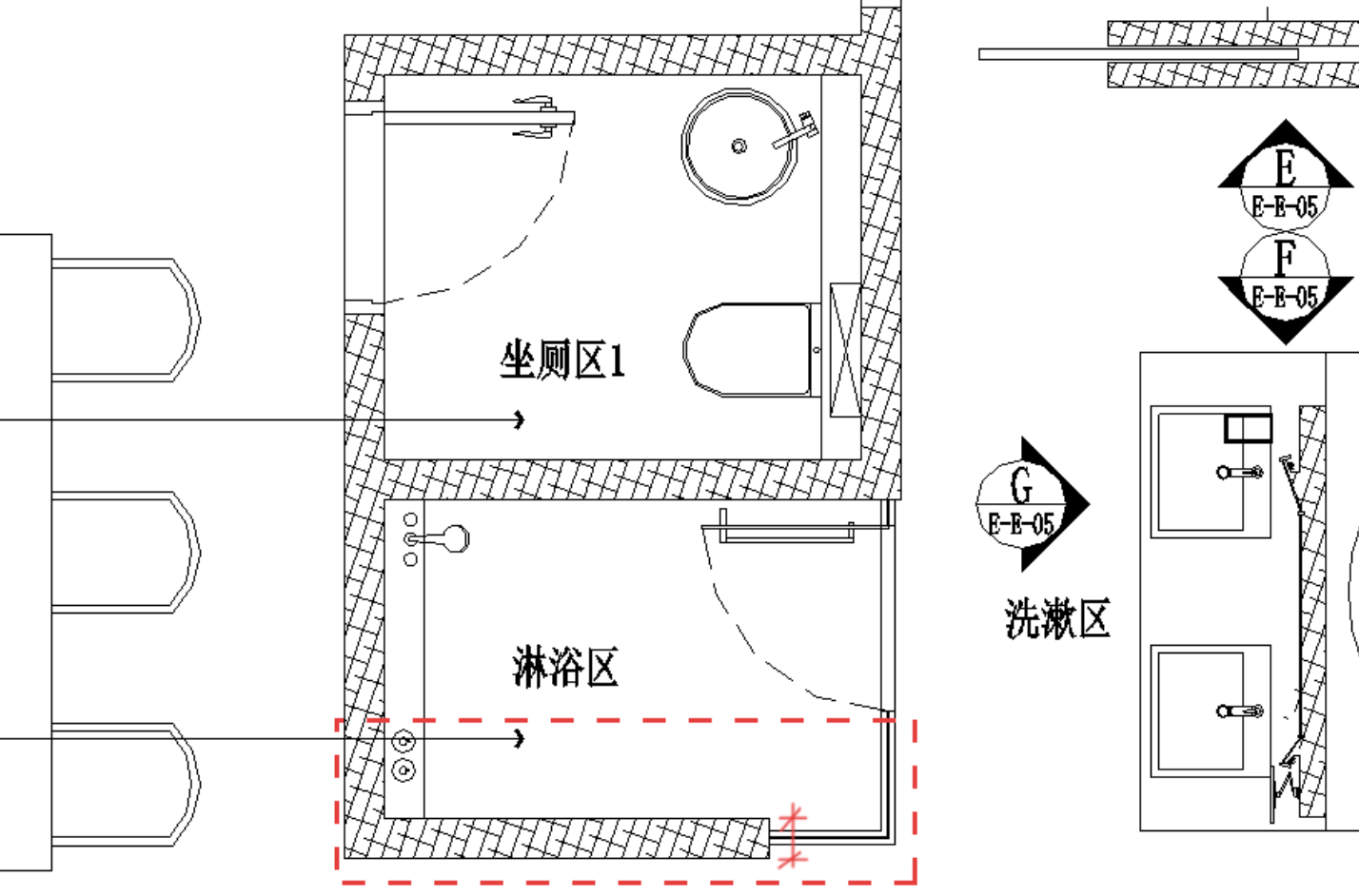 标号2:洁具图示,与家具一样,所见即所得,同时,若图纸直接用于指导施工(如住宅项目),则应该注意检查洁具的选型尺度与平面空间的尺寸关系,避免出现洁具设备与平面布局冲突的现象发生。