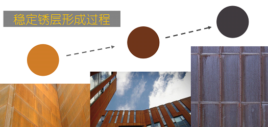通过加入铜、铬、镍这些耐候性元素,钢铁材料在锈层和基体之间形成一层约50~100μm厚的氧化物层,显露出均匀的自然锈红色。