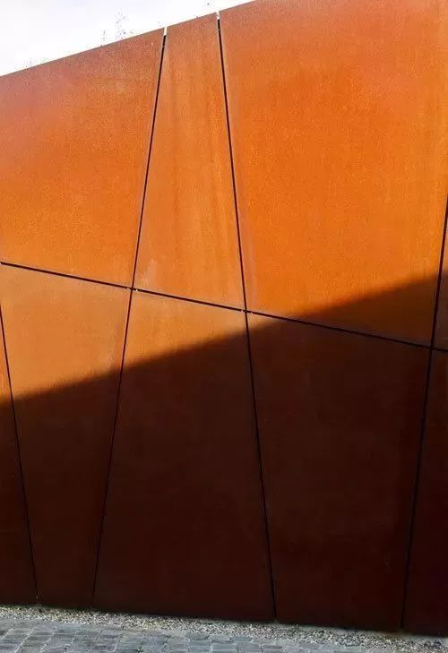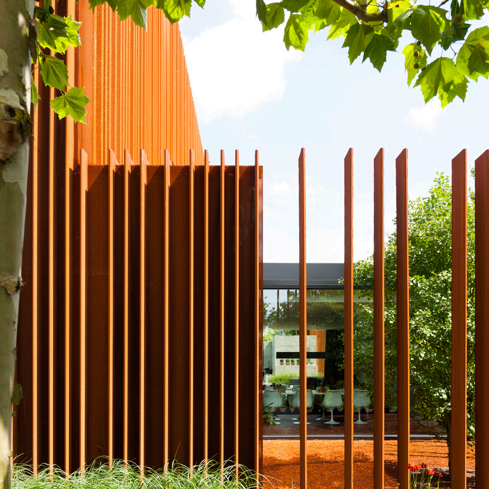 单片耐候钢焊接在穿孔钢板上作为房屋立面,锈化的钢板,轻薄且坚固。