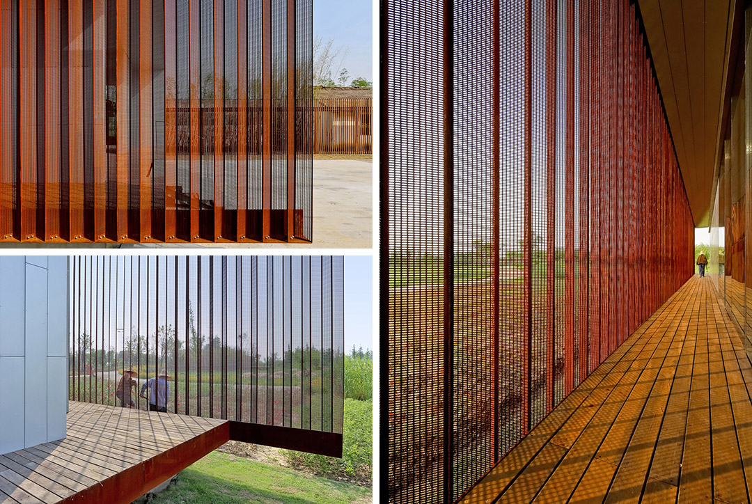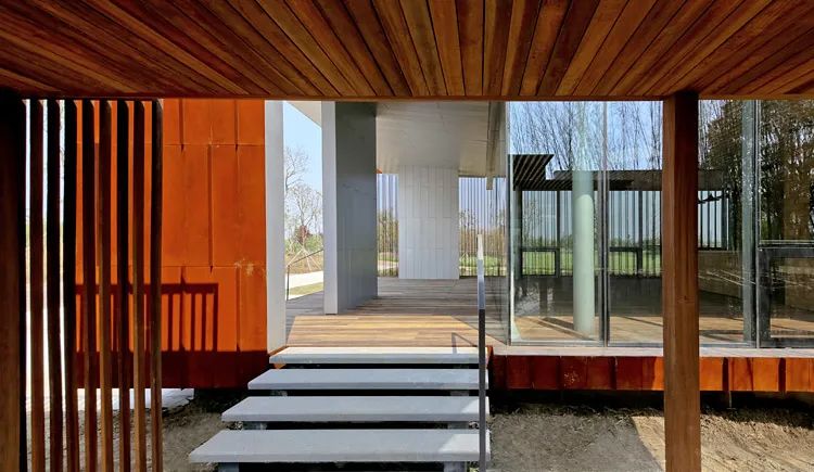 接下来是位于苏州昆山的有机农场招待中心,直向建筑利用中空的管状耐候钢材,作为回廊立面。