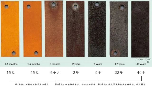 至少需要经过数年的时间,才能形成致密的保护性锈层,其外观也是在逐渐变化的。