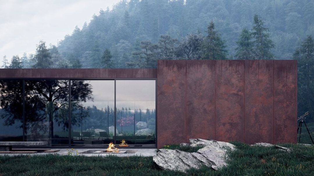 这是一座由混凝土、耐候钢、玻璃和水元素共同构成的小屋,Rose的名字来自于玫瑰色的耐候钢外立面。