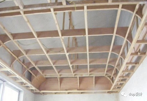 线型天花(曲线),曲面天花(二维和三维)的构造做法分为以下3种,主要变化是“骨架”材料的不同。