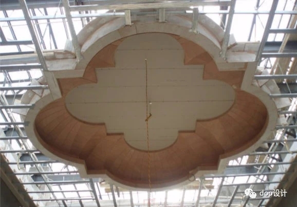 其实无论是曲线造型的天花还是曲面的天花造型,都是通过“骨架”搭建出造型,然后覆基层板,粘贴饰面材料或涂料处理,复杂的造型还需要在地面搭建骨架做完之后,吊装到天花板上去。