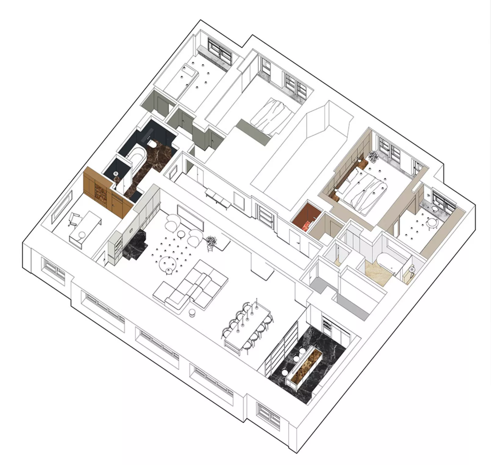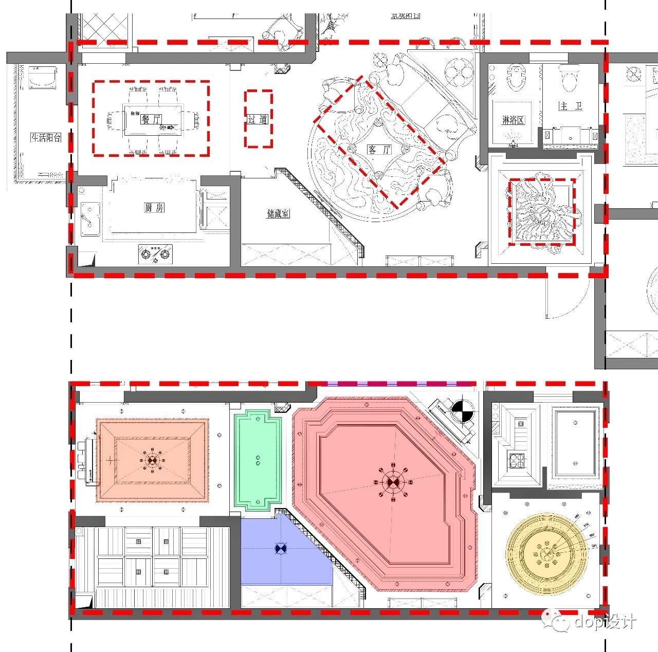 而除了平面中的墙体之外。影响天花很重要的一个因素还有“家具”,天花造型是选择居家具中心,还是居空间中心。