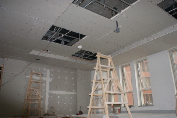 石膏板安装从顶棚中间顺主龙骨方向开始,石膏板长边与主龙骨方向一致,向两侧伸延分行。固定罩面板使用镀锌自攻螺钉。