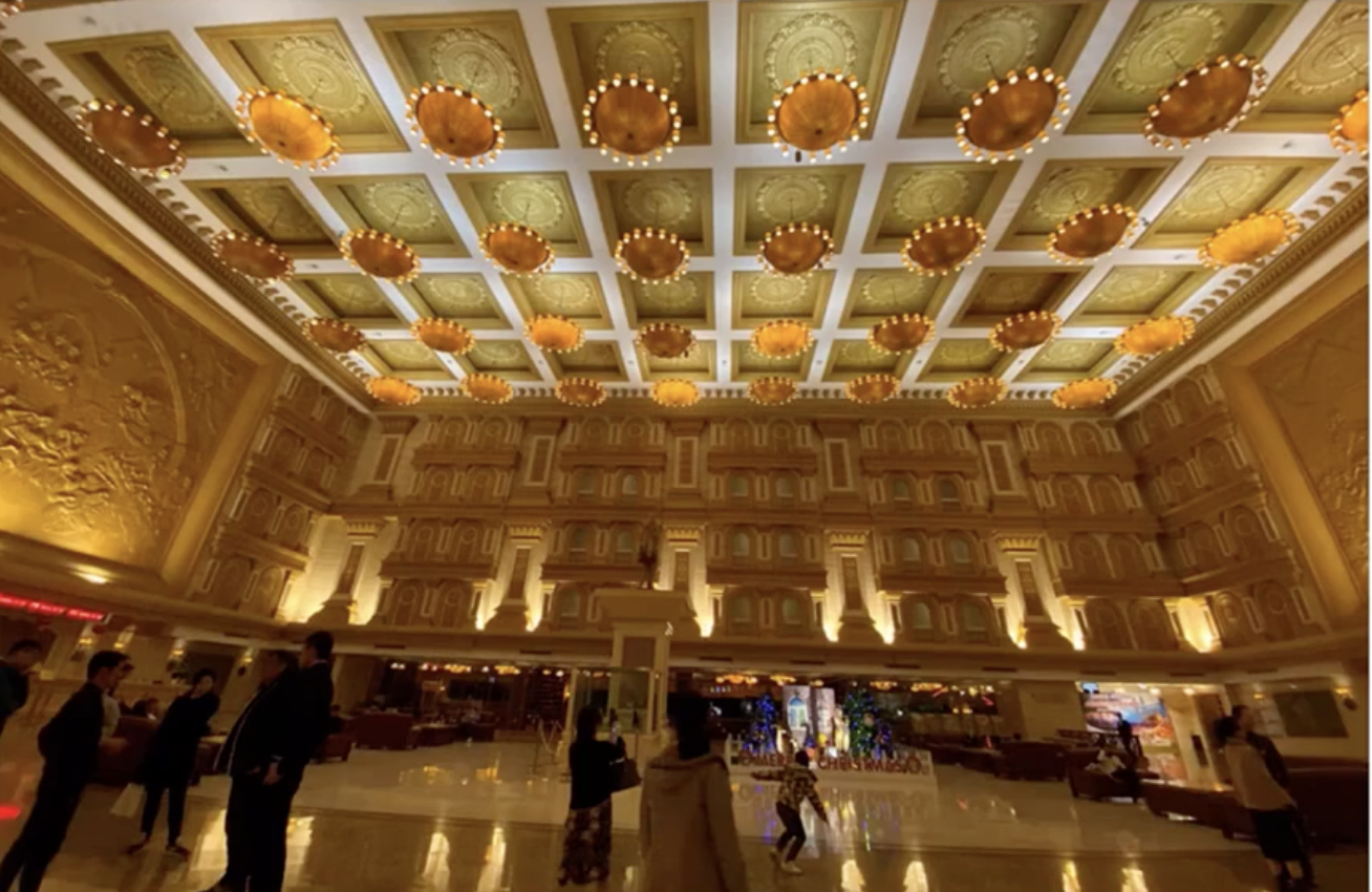 在这个酒店空间中,采用的间接照明,由于层高较高,导致空间照度不高,其次空间灯光缺乏层次,比如前台区缺乏重点照明的灯光,就无法给用户重点引导。