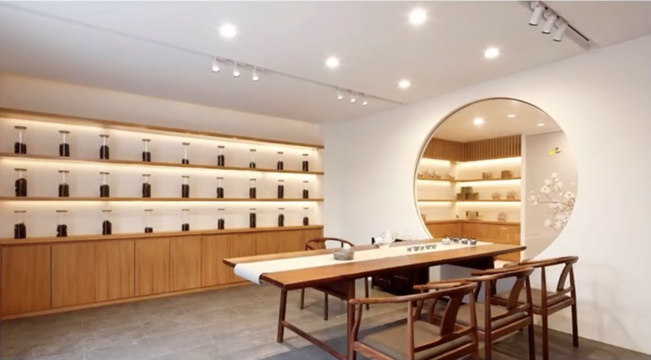这是一个茶室空间,面积并不大,但顶面采用嵌入式筒灯和轨道射灯,共18组灯具,使得茶室空间过于明亮,给人的心理感受是急促的,不符合喝茶聊天的空间氛围。