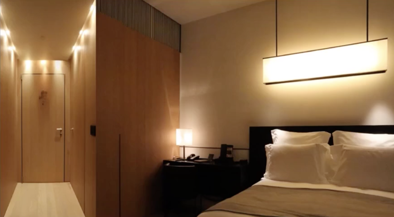 这是一个酒店空间,过道做为一个过渡空间,在空间照明上,不以亮为主,以能看清楚即可。床品区设计的灯具也是过多布置。