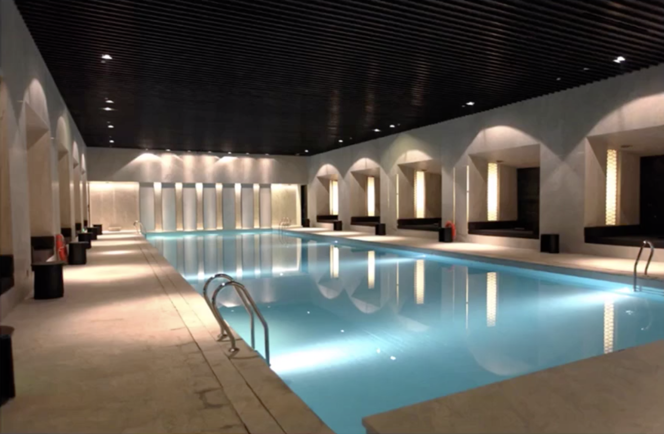 比如,在这个游泳池空间,布置的灯具并不多,而由于灯具设计的位置不合理,同时墙面石材、泳池的水都是易反光的,造成整个空间过于明亮,失去空间本该有的氛围。