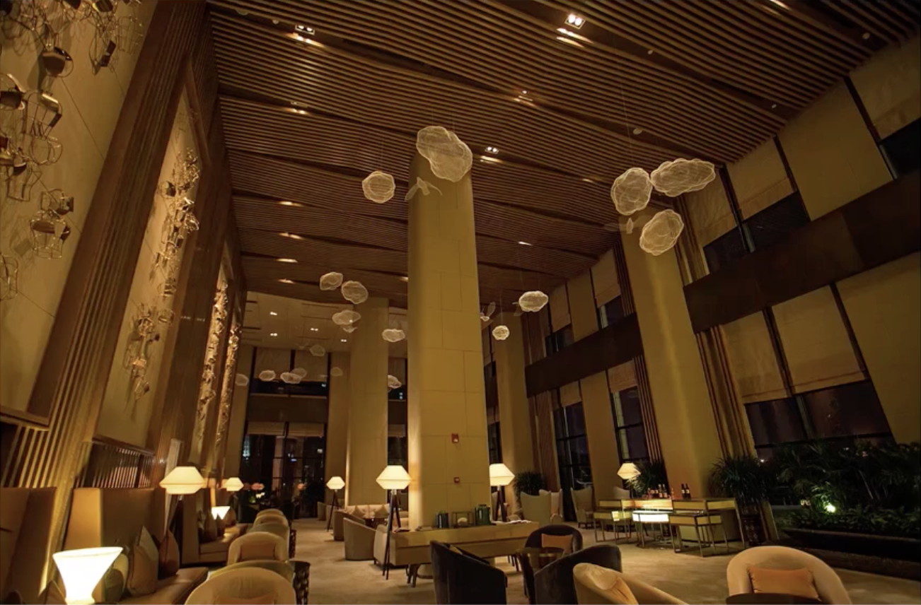 比如下图中的这个酒店大堂的灯光通过高、中、低以及立面照明四个维度来营造空间的灯光层次。