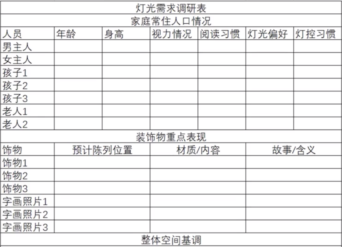 首先,要明确使用者是谁?了解使用者的年龄、性别、视力、喜好以及有没有特殊的要求等。(建议大家在灯光设计的沟通阶段,可以做一个灯光需要调研表。)