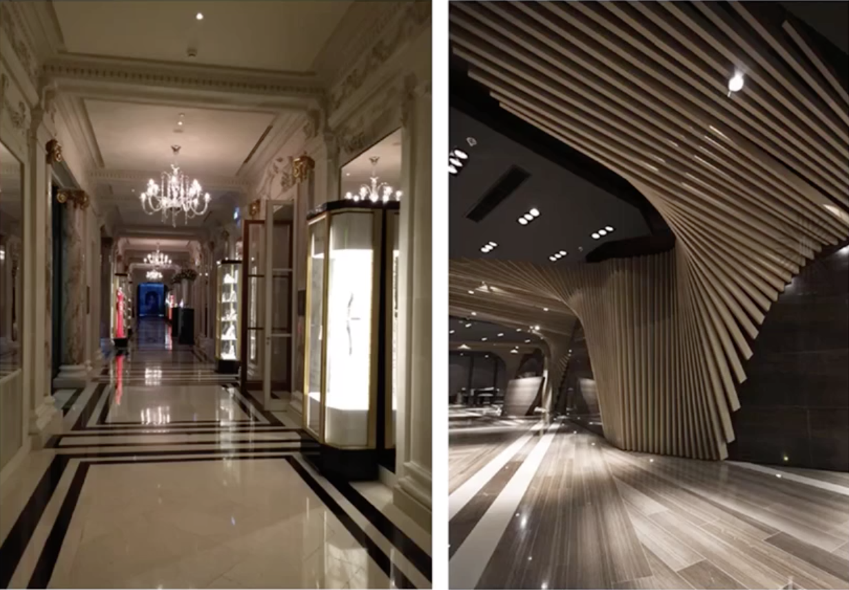 左侧图,墙面的雕花、罗马柱,缺乏泛光来表现墙面装饰的细节。右侧图,立柱的形态有一种动态的感觉,但灯光却采用了普通的格栅射灯,无法体现这种动态的设计。