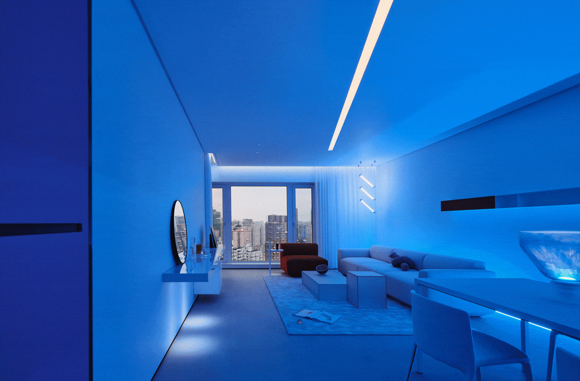 比如,餐桌正上方,定制匹配餐饮使用的专属光源,合适的光束角和照度,以及考虑餐桌材质的反射系数。而墙面的装饰柜,采用的是内藏射灯和灯带,增加立面的层次。