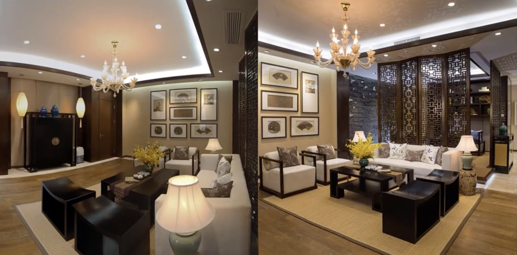 这个案例灯光问题很明显,一中式风格的色温建议选用3000K/3500K,但实际灯带选用的是冷白光,二选用的主灯跟整体空间风格不符,三对于重点区域缺少重点照明,无法形成视觉焦点,比如茶几、装饰柜、装饰画等都应该采用重点照明。