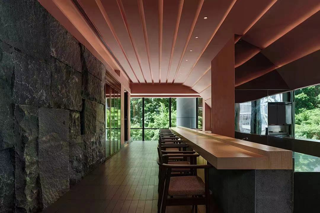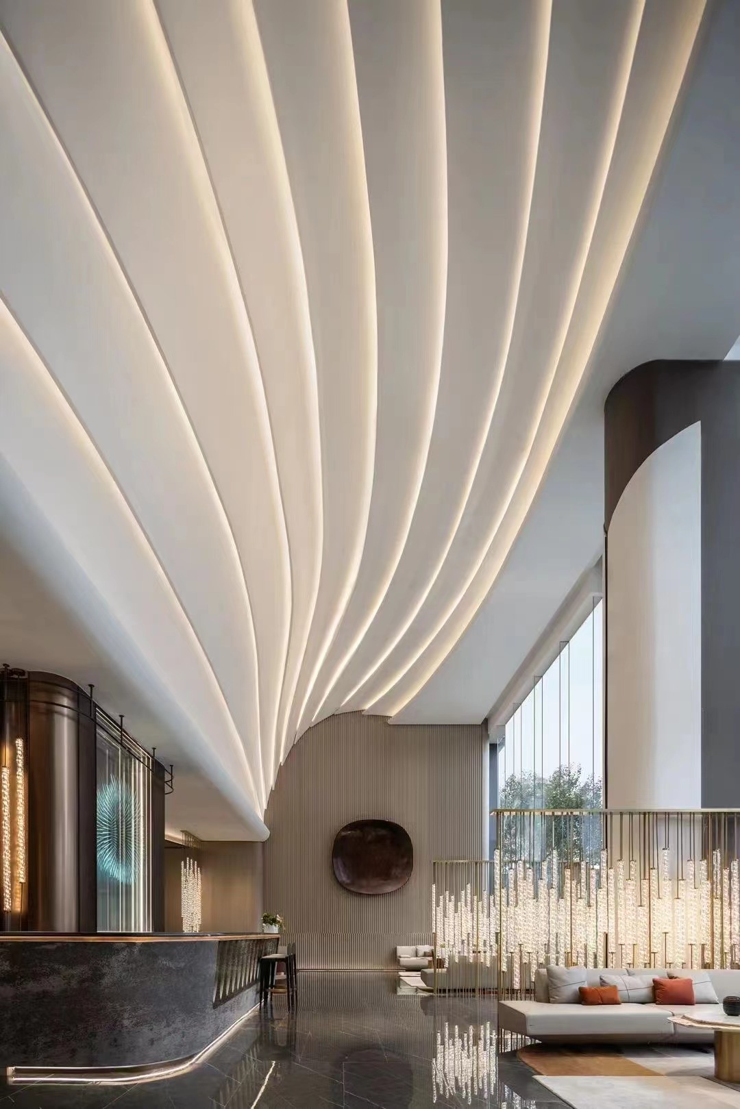 如果在格栅中间采用动态的、有节奏感的线条灯,与这种动态的装饰就更加契合。