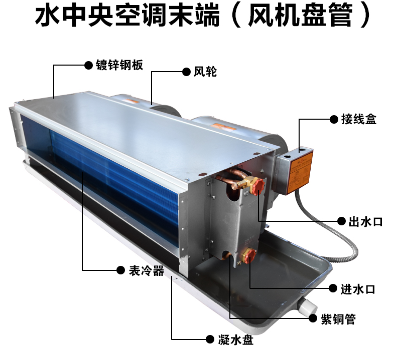 风机盘管是中央空调末端产品,由热交换器、进出水管、过滤器、风轮、接水盘、接线盒、排气阀、支架等组成。