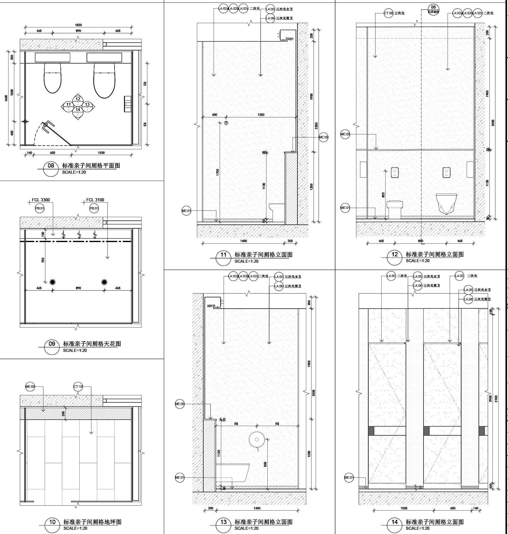 二次元洗手间:浅灰色瓷砖(600*600*8mm)和深化灰色仿石瓷砖(900*300*8mm);三次元洗手间:深色仿大理石瓷砖(600*600*8mm);儿童洗手间:水磨石花纹瓷砖(600*600*8mm)。