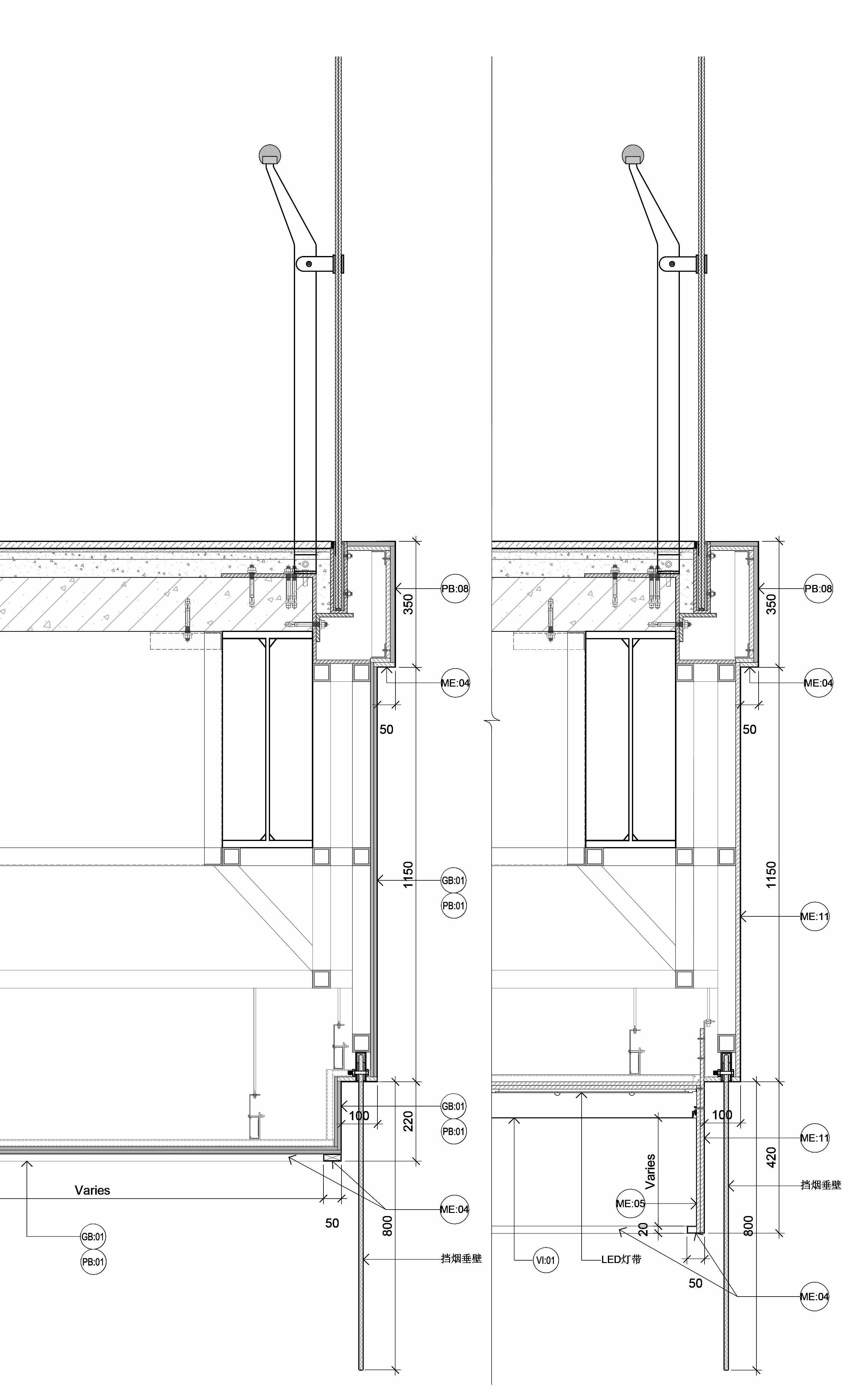 灯带与设备:LED灯带(ME:09)、排风口与喷淋头协调布置。