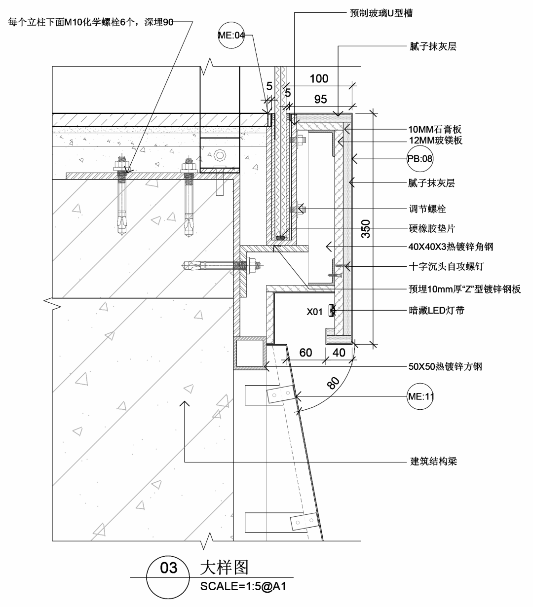 预制玻璃U型槽固定需用不锈钢挂件,螺栓固定(M5×40螺杆),要求镀锌处理。
