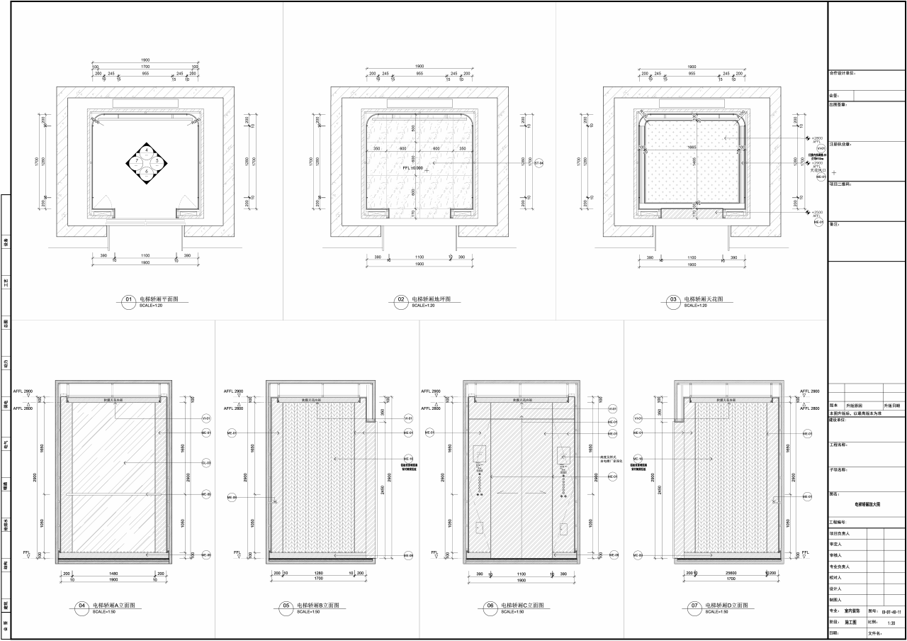 电梯轿厢内饰面:铝板打印菱形花纹和镜面玻璃,电梯厅地面菱形切边,嵌实心黄铜条。墙面主要采用拉丝香槟不锈钢,表面需抗指纹处理。