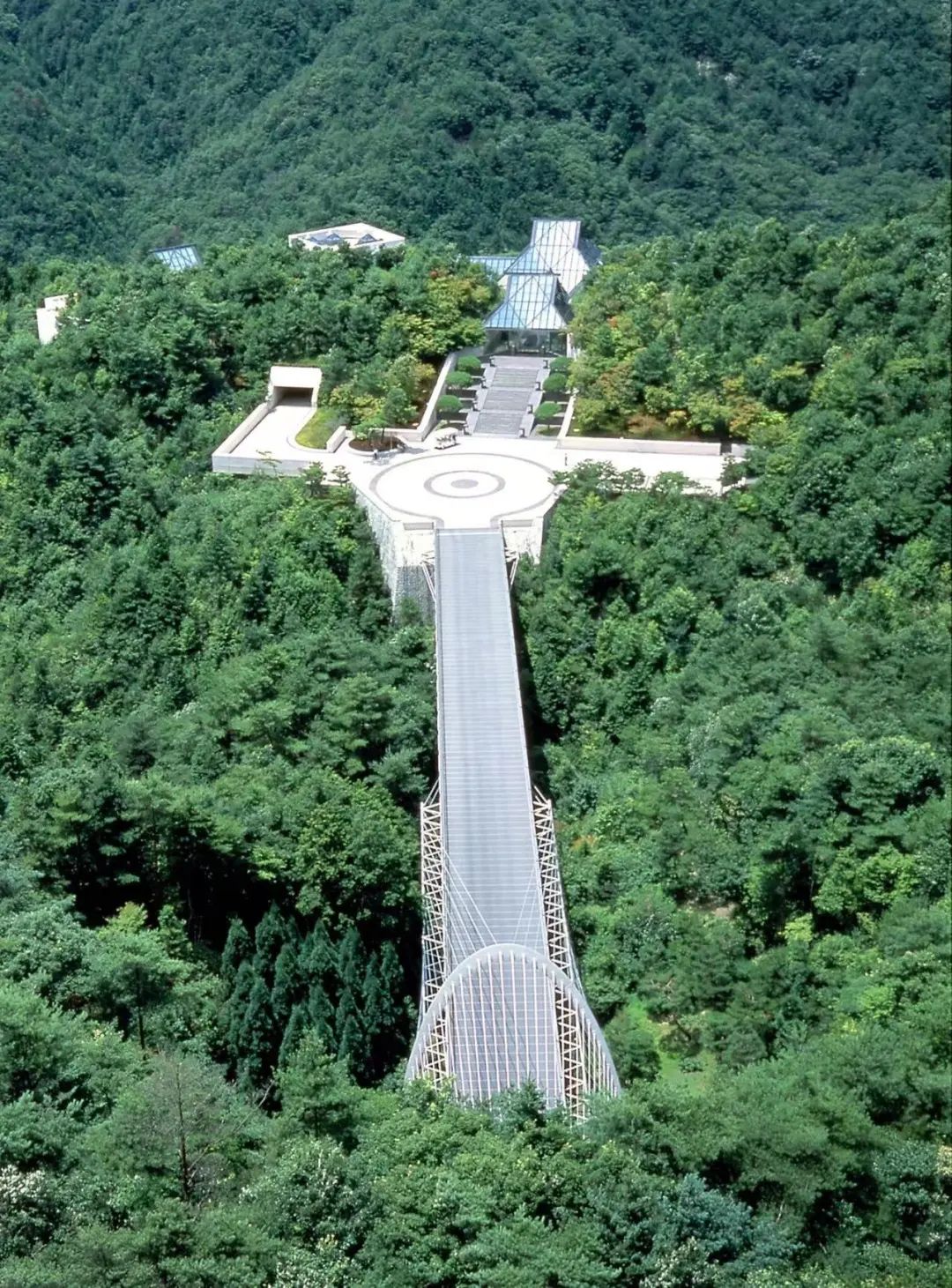 三保博物馆坐落在日本信乐县自然丰富的山脉中。贝聿铭以《桃花源记》中所描绘的世外桃源为设计概念,整体建筑以林荫小道为引导,游客需要越过隧道和吊桥方能到达美术馆。