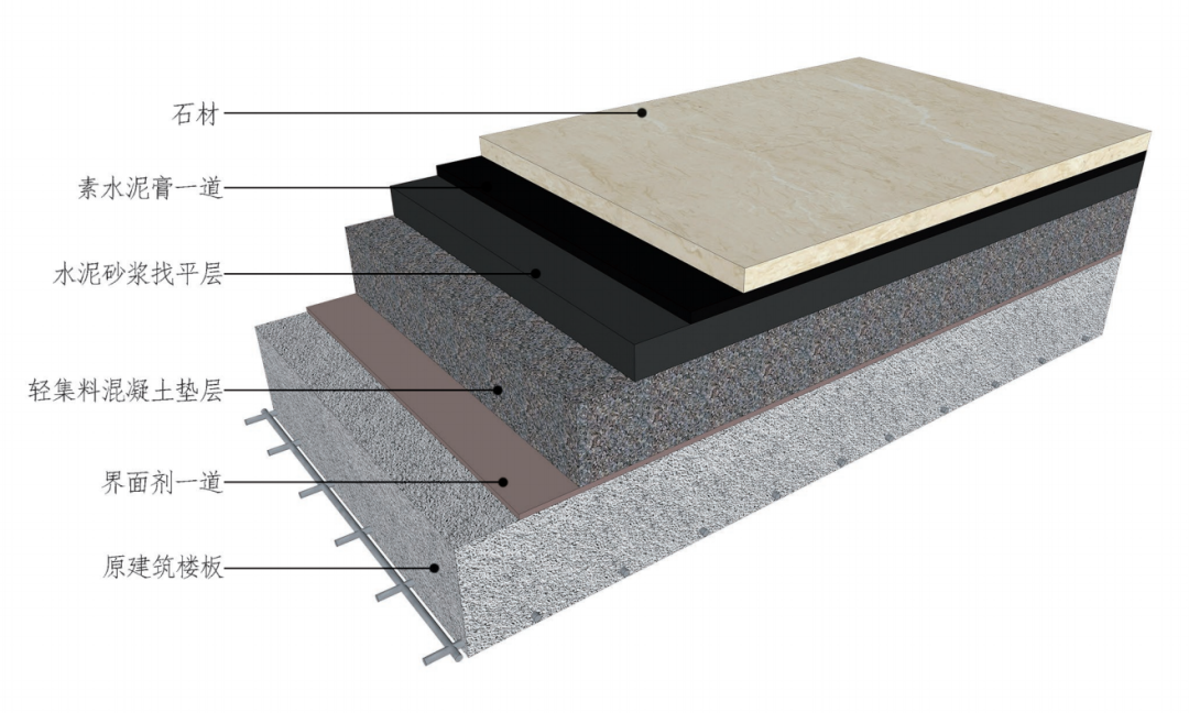 前期准备→弹线定位→核对编号→根据安装图试拼→基层处理→铺设水泥砂浆结合层→铺装石材→擦缝处理→清洁养护