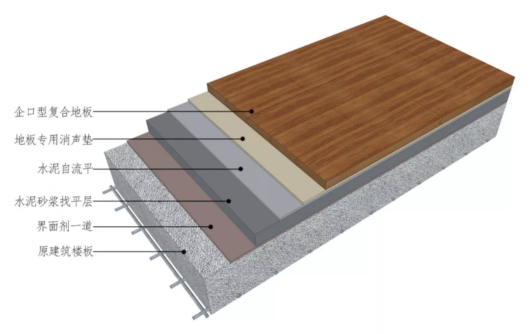 施工准备→基层找平→铺装防潮层→铺装专用消声垫→铺装地板→安装踢脚线→成品保护