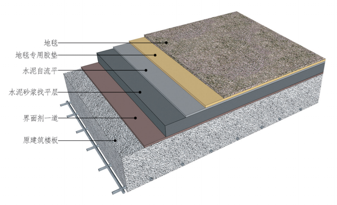 前期准备→基层处理 →弹线、套方、分格、定位→地毯剪裁→钉倒刺板挂毯条→铺设衬垫→铺设地毯→细部处理及清理