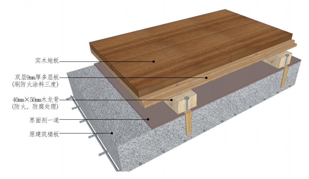 施工准备→基层找平→铺装防潮层→安装减震垫→安装木龙骨→安装多层板→二次防潮→铺装地板→安装踢脚线→成品保护
