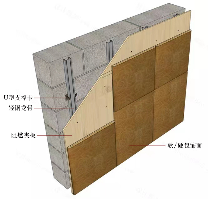 施工准备→测量、弹线→安装基层龙骨→龙骨验收→安装基层夹板→制作软/硬包板→安装、粘贴软/硬包板
