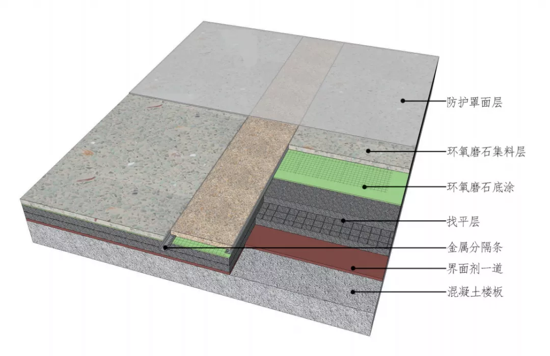 前期准备→基层处理→环氧底涂层施工→安装造型分隔条→环氧磨石层干燥养护→研磨机全盘粗磨、中磨、精磨→涂装密封涂层→高速抛光→成面完工