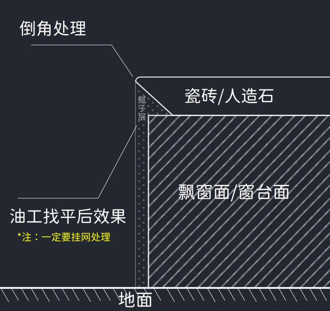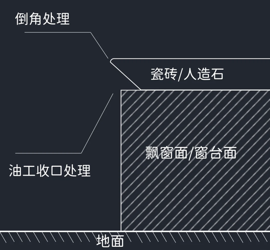 防开裂措施必不可少。如果害怕直接收口带来的开裂问题,可以在石材底部外侧铣出5*5mm的凹槽。需要注意的是一定要等腻子批完之后再测量石材尺寸,避免后期不平齐导致安装问题过大。